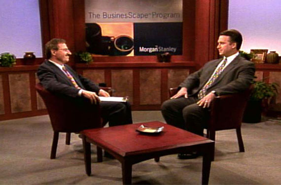 This corporate news look features a cove-lit desk and inkjet printed set panels framing plasma monitors.