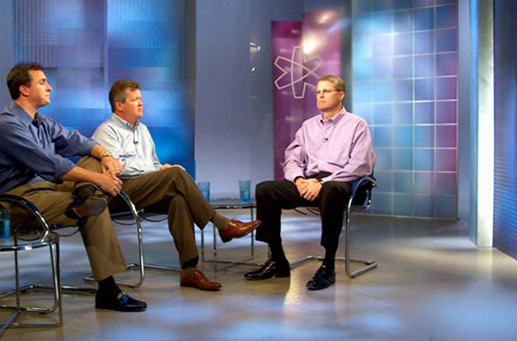 Brushed aluminum faux finish panels and backlit windows create a distinctive background for a cove lit desk in this modular set.